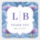 This is a floral style image featuring an elegant and sophisticated thank you card. The background showcases intricate blue floral patterns with delicate lavender flowers, creating a serene and graceful atmosphere. At the center, a white scalloped frame elegantly displays the initials "L | B" in bold purple letters, followed by "THANK YOU" and the date "MAY 23, 2026." The overall mood is one of appreciation and refinement, making it perfect for expressing gratitude at weddings or special events.