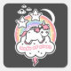 Um unicórnio super fofo voando no ar com arco-íris pastel e úfos. Somos todos feitos de estrelas.