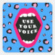 Use sua voz! Fale, mesmo que sua voz trema. O fundo de impressão do leopardo em azul e rosa mostra uma vibrante boca rosada gritando.