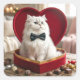 A charming white Persian cat, elegantly dressed in a chic black bow tie, is sitting in a delightful red Valentine's Day chocolate candy box