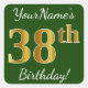 Este simples design de aniversário apresenta uma mensagem como "38º Aniversário do Vosso Nome!", com o "38º" a ter uma aparência falsa e imitada de cor inspirada em ouro, num fundo de cor verde. O nome pode ser personalizado. Os adesivos como estes podem talvez ser um presente para alguém que comemora os seus trinta e oito anos de aniversário, ou talvez possam ser usados como decorações numa festa de aniversário. [~Z0000244]