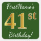 Este simples design de autocolante de aniversário apresenta uma mensagem como "O Aniversário de 41ruas da FirstName!", com a "41ruas" a ter uma aparência falsa e imitada de cor inspirada no ouro, num fundo de cor verde. O nome pode ser personalizado. Os adesivos como estes podem talvez ser um presente para alguém que comemora o seu quarenta primeiro aniversário, ou talvez possam ser usados como decorações numa festa de aniversário. [~Z0000244]