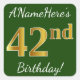 Este simples design de aniversário apresenta uma mensagem como "ANameHere's 42nd Birthday!", com o "42º" a ter uma aparência de cor falsa/imitada inspirada em ouro, num fundo de cor verde. O nome pode ser personalizado. Os adesivos como estes podem talvez ser um presente para alguém que comemora os seus quarenta segundos anos, ou talvez possam ser usados como decorações numa festa de aniversário. [~Z0000244]