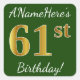 Este simples design de aniversário apresenta uma mensagem como "ANameHere's 61rua Birthday!", com a "61ruas" a ter uma aparência falsa e imitada de cor inspirada no ouro, num fundo de cor verde. O nome pode ser personalizado. Os adesivos como estes poderiam talvez ser um presente para alguém que comemora o seu sessenta primeiro aniversário, ou talvez pudessem ser usados como decorações numa festa de aniversário. [~Z0000244]