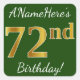 Este simples design de aniversário apresenta uma mensagem como "ANameHere's 72nd Birthday!", com o "72º" a ter uma aparência de cor falsa/imitada inspirada em ouro, num fundo de cor verde. O nome pode ser personalizado. Os adesivos como estes poderiam talvez ser um presente para alguém que comemora o seu setenta e segundo aniversário, ou talvez pudessem ser usados como decorações numa festa de aniversário. [~Z0000244]
