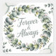 Um delicado cartão de parabéns de casamento com uma bela grinalda de eucalipto em aquarela em tons de verde menta e verde sálvia, rodeando um fundo branco sutil e texturizado. A grinalda incorpora raminhos espalhados de gipsófila e pequenos acentos semelhantes a pérolas, criando um sentimento elegante e ligeiramente rústico, com um brilho suave que realça o efeito de aquarela. No centro da grinalda, o texto “PARA SEMPRE & SEMPRE” é exibido em uma fonte moderna e fluida em um tom cinza-prata suave, complementando os tons naturais e evocando um senso de romance atemporal. O interior do cartão oferece amplo espaço para uma mensagem sincera e incorpora uma ilustração simplificada de um ramo de eucalipto no canto inferior, mantendo o tom emocional sereno e comemorativo.
