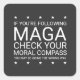 Um adesivo preto com uma design de estrelas de texto personalizável dizendo "Se você está seguindo MAGA, verifique sua bússola moral, você pode estar indo no caminho errado". Você pode mudar a cor das estrelas e o texto para sua preferência.