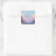 Step into a world of vibrant, painterly beauty with this stunning landscape sticker. The design features a breathtaking mountain valley, rendered in a rich, fantastical color palette reminiscent of a dream. Lush trees and bushes burst with vibrant pink, magenta, crimson, and soft blue blossoms, creating a magical frame around the scene. These colorful slopes lead down into a hazy valley, with distant mountains rising against a beautiful, painterly sky swirled with soft blue, pink, and white clouds. A minimalist, thin gold square frame provides a clean, elegant border for your message, adding a final touch of sophistication to this ethereal vista. These stickers are perfect for businesses that evoke creativity, beauty, and imagination, such as artists or photographers, boutique event planners specializing in vibrant themes, travel agencies promoting scenic destinations, or unique gift shops. This versatile design can also be used to beautifully seal envelopes for colorful weddings or special events, or as a sophisticated accent on party favors and gift wrapping.