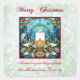 Design de vidro brilhante e vibrante manchado de um buquê de feno de Natal e bagas que rodeiam uma vela, num quadro vermelho. Com um fundo brilhante verde claro e "Feliz Natal". Você pode mudar a saudação pessoal personalizável na parte inferior do design para sua própria mensagem.