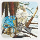 Gato da Floresta Norueguesa sentado ao lado de uma árvore com um dragão azul sentado num capacete de garrafa. Neve ao redor deles, espada e machado viking com eles.