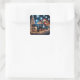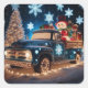 Caçadores de férias em forma de quadrado, bonitos, com um adorável bonzinho de neve, a montar atrás de um caminhão de recolha azul