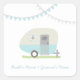 Um adesivo de casamento com ilustração de um trailer de safra azul com caixa de janela de flores. Azul e cinza no topo. Personalize com nomes de noiva e noiva.