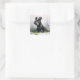 A soft watercolor-style illustration of a calm schnauzer seated among delicate blue wildflowers and meadow grasses, featuring gentle textures, a light neutral background, and a peaceful, natural atmosphere.