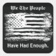 Make a political protest statement with this "We The People" sticker. This simple striking black and white design features a grunge art style image of the American flag with stylized text captioning "We The People Have Had Enough". Text can be edited.
