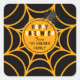 Este adesivo de Halloween personalizado apresenta uma aranha preta sentada numa teia de aranha laranja. O design é então colocado sobre um fundo preto. No centro do adesivo, há um texto personalizável que você pode mudar para adicionar o nome de sua família ou o que quiser.