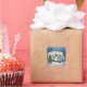 A cute whimsical Christmas sticker with a woodland creatures theme. A deer and raccoon sitting nearby a vintage teal camper on a snowy winter night.