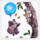 Winnie o Pooh disfarçado de uma Nuvem Negra voando sobre um grande balão azul pintado em uma técnica de verão com tinta sumi e aquarelas em papel de arroz.