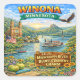 Celebrate the scenic beauty and river-town charm of Winona, Minnesota with this vibrant, vintage-inspired illustration. Set along the majestic Mississippi River, this colorful design showcases iconic local landmarks including the Basilica of St. Stanislaus Kostka, the historic Latsch Island boat houses, a classic paddlewheel riverboat, and the dramatic bluffs of Bluff Country, all bathed in a glowing sunset.