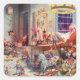 Belos adesivos de vintage com Papais noeis com seus elfos na oficina.