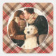 O design de adesivo de Natal apresenta sua foto com um quadro elegante e pré-colorido de cor castanha, vermelha e xadrez branca de tartã.