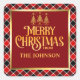 XADREZ Negra Vermelha PERSONALIZADA Dourada Vinheta de Natal Feliz. Personalize este belo ouro Vestido de Natal com seu nome. Tema - xadrez de natal preto vermelho, aparência de folha de ouro, ouro preto vermelho, árvore de natal ouro, personalizável, simples, elegante, minimalista, moderno, mágico. Decorativo. Adequado para autocolante quadrado. Criado por Artfulz!