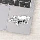 Um pinguim é representado com humor voando com uma mochila de foguete e vestindo um capacete.