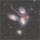 Um balé cósmico de cinco galáxias trancadas em um abraço gravitacional se desenvolve nessa imagem infravermelha capturada pelo telescópio espacial James Webb. Placas torres de gás se esticam em toda a cena, raspadas de suas pegadas pelas forças ferozes da dança. Enquanto algumas galáxias borram com a luz de estrelas recém-nascidas, outras suportam as marcas da interação implacável, alterada para sempre por essa coreografia celeste. - Esse arquivo está no dominio público dos Estados Unidos porque foi criado exclusivamente pela NASA.
