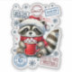 Um guaxinim alegre veste um chapéu vermelho de Papai Noel enquanto segura uma caneca de cacau quente cozida com marshmallows. Cercado por selos festivos e flocos de neve, esta criatura deliciosa captura o espírito do Natal, pronto para o feriado.