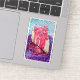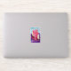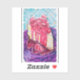 A slice of cake topped with vibrant red raspberries drips with rich sauce onto a dark purple plate. The background features a blue lattice pattern, complementing the dessert's vivid colors.