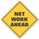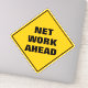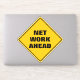 Sinais engraçados e clássicos de caução de diamante amarelo advertem sobre o trabalho de rede à frente em uma espessa fonte preta de sans serif, que é um sinal de aviso para a placa de trabalho de estrada que será apresentada em seguida.