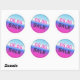 06.06 etiqueta adesiva redonda à venda com um gradiente holográfico brilhante, cor rosa brilhante e fonte pontilhada a preto
