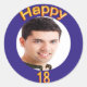 Um adesivo para uma 18ª festa de aniversário para caras. Modelo para sua foto. Fundo azul e texto: 18. O texto é escrito com um guião de balão de ouro falso de tendência.