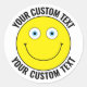6 caracteres adesivos Yellow Happy Face grandes de 3" personalizados de texto personalizado - OPÇÃO OLHOS AZUIS e opção BOCA NEGRA para fundo mais leve. Faça alguém sorrir, dando-lhe um presente com um adesivo de rosto feliz. Consulte a área de armazenamento para cheio de opções personalizadas. Personalize completamente todo o texto com a(s) mensagem(ões). Personalização de texto superior e inferior com um clique nos adesivos personalizados clicando em 'Personalizar este modelo'. Você também pode mudar a cor do rosto feliz para qualquer cor personalizada ou imagem de fundo. Clique em 'Personalizar este modelo', em seguida em 'Editar usando a ferramenta design' e em 'BACKGROUND'. Clique em 'Carregar Imagem de Fundo' e substitua o fundo existente pela sua própria imagem (padrão, design etc.), ou clique na caixa 'Imagem Atual' para remover e escolher entre as 40 cores listadas, ou clique na primeira caixa de cor (+) para inserir qualquer código de cor hexadecimal para alterar a cor de Rosto Feliz nos adesivos. Faça seu próprio presente de aniversário embrulhando adesivos para uma criança ou qualquer pessoa que goste de coisas engraçadas, ou crie seu próprio bolo de Natal ou presente personalizado para você mesmo.