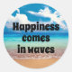 bela vista de praia com texto que diz: "A felicidade vem em ondas"
