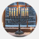 Happy Hanukkah! A pretty illustration of a menorah on a window sill on a snowy winter day.