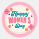 O vinheta giro giro e giro internacional feminino. Típica colorida retrógrada e autocolante para celebrar o dia das mulheres no mundo, igualdade, progresso para as mulheres. Ideia de presente para mulheres, raparigas, adolescentes, adultos, esposas, dama chefe. Um adesivo bonito e cor-de-rosa para notebook, embalagem, escola, trabalho, organização.