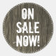 Este design de venda de autocolante redondo apresenta a mensagem "ON SALE AGORA!". Ele também apresenta um fundo de aparência falsa. Ele poderia ser usado em uma loja de varejo para marcar mercadorias cujo preço foi reduzido.