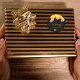 Um fundo preto chic decorado com mel dourado pingando. O texto: Abeja Feliz com um estilo de letra dourada manuscrita com floreios. Personalize e adicione seu nome, nome da família. Para festas de verão, casamentos, churrascos no quintal.