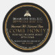 Seu nome apiário parece incrível em uma fonte decorativa branca clássica que se reflete de forma artística em ouro escuro em um fundo preto. (apagar reflexo apiário se não desejar) Ilustração Vintage bee em cima do rótulo. A localização e o volume do produto são inscritos na parte inferior do rótulo com a palavra "COMB HONEY", que ocupa o campo central num tipo de letra metálica dourada esculpida.