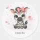 Cute baby shower or birthday sticker featuring adorable little female zebra wearing a cute pink bow with some love hearts
