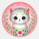 Adesivo Redondo Adorável Gatinho Branco Cercado por Flores Rosa