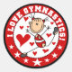 Uma ginasta de figura de palitos em um leotard vermelho com muitos corações vermelhos e texto que lê I Love Gymnastics on gymnast T-shirts, botões, capuzes, canecas, bolsas, cartas, botões, chaveiros, keepsakes, e muito mais.