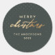 Espalhe alegria natalina com nosso Adesivo Festivo. Um fundo verde escuro com bolinhas de folha de ouro falso define o palco para "Natal" em tipografia clássica sem serifa e "Feliz" em letra cursiva elegante. Personalize ainda mais com o nome da sua família e o ano. Perfeito para selar envelopes ou adicionar um toque de elegância aos seus presentes de Natal.