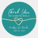 Adesivo de agradecimento de casamento azul turquesa simples, elegante e minimalista, com coração de corda dourada e caligrafia moderna manuscrita.