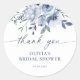 Adesivo de agradecimento de chá de noiva com flores azuis poeira e caligrafia elegante.