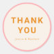 Este design de adesivo "Obrigado" apresenta uma estética limpa e moderna com uma paleta de cores quentes de rosa, laranja e branco. O texto em negrito "OBRIGADO" é centralizado e complementado pelos nomes ou detalhes personalizáveis abaixo em uma fonte minimalista sem serifa. Perfeito para selar sacos de favores, envelopes ou embalagens de presentes, este adesivo versátil adiciona um toque atencioso e sofisticado a qualquer evento especial, como casamentos, chás de bebê ou festas.