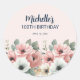 Adesivos personalizados de festa de aniversário de 100 anos com flores de água-forte rosa e branca e folhagens personalizados com o nome e idade do homenageado. Entre em contato para obter ajuda com suas personalizações ou para solicitar produtos Zazzle adicionais correspondentes ou coordenados para sua celebração.