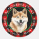 Um belo retrato de um Cachorro Akita Inu está no centro deste adesivo de endereço de retorno. A imagem é colocada sobre um fundo preto e enquadrada em verde de Natal. O texto em branco tem seu nome e endereço em uma borda circular de xadrez de búfalos vermelha e preta. Brilhante e festivo!
