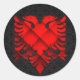 Vinheta com um design, símbolo nacional albanês da águia de duas cabeças, a vermelho, sobre fundo preto.