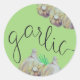 Um rótulo redondo clássico que mostra a ilustração do alho e a inscrição. Ideal para os recipientes de especiarias da cozinha ou decoração.
